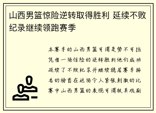 山西男篮惊险逆转取得胜利 延续不败纪录继续领跑赛季