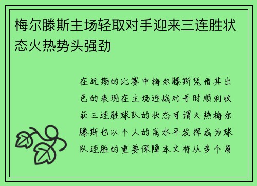 梅尔滕斯主场轻取对手迎来三连胜状态火热势头强劲
